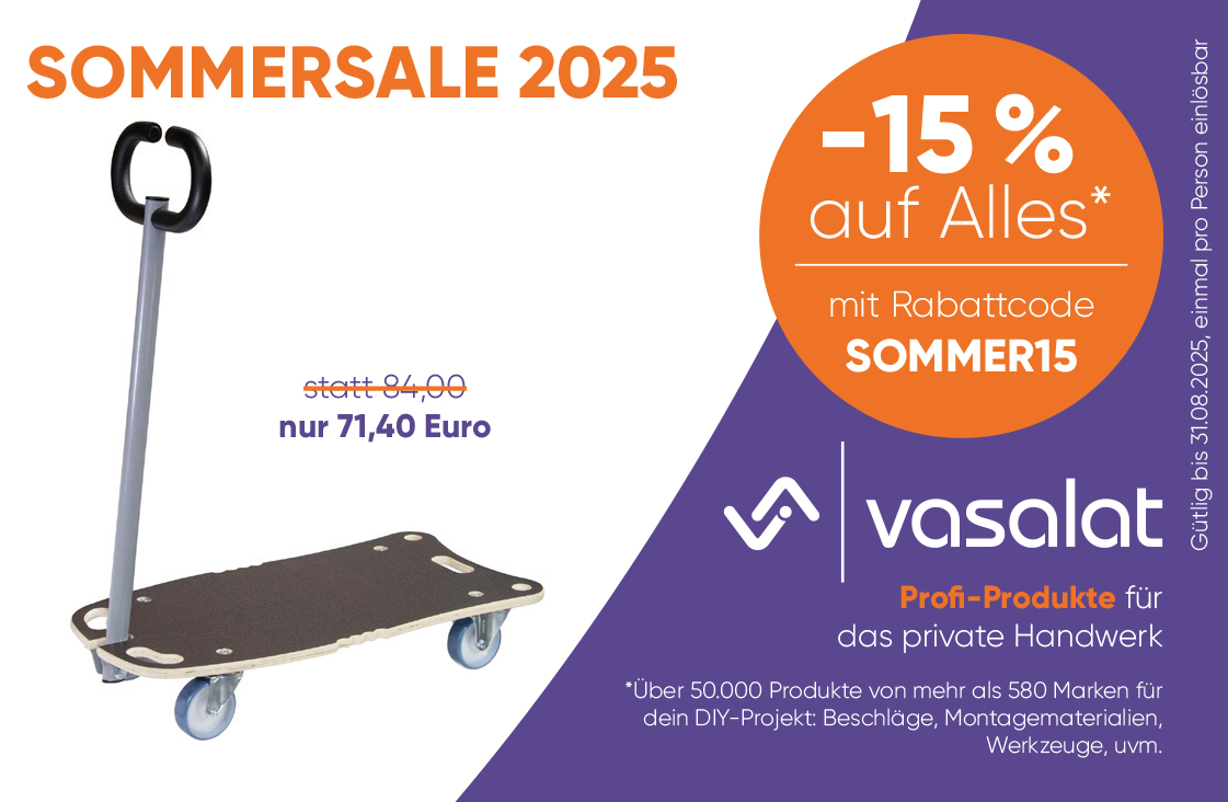 -15 % auf Alles bei vasalat.com | Über 50.000 Produkte von mehr als 580 Marken für dein DIY-Projekt: Beschläge, Montagematerialien, Werkzeuge, uvm. Vasalat Startdatum 05.08.2025 Ablaufdatum 31.08.2025 *haus&garten Code SOMMER15 Couponcode kopieren Coupon einlösen Coupon drucken! Preis ohne Coupon 84.00€ Preis mit Coupon 71.40€ Ersparnis 12.60€