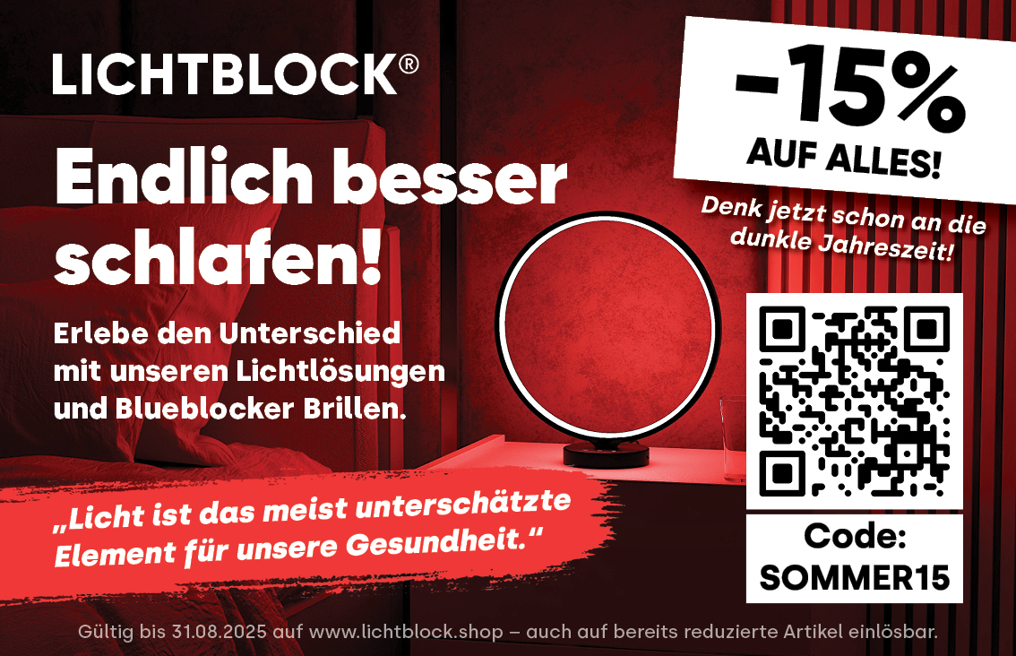 -15% AUF ALLES! Endlich besser schlafen! LICHTBLOCK! Lichtblock GmbH Startdatum 07.07.2025 Ablaufdatum 31.08.2025 Erlebe den Unterschied mit unseren Lichtlösungen und Blueblocker Brillen.Denk jetzt schon an die dunkle Jahreszeit!„Licht ist das meist unterschätzte Element für unsere Gesundheit." Code SOMMER15 Couponcode kopieren Coupon einlösen Coupon drucken!
