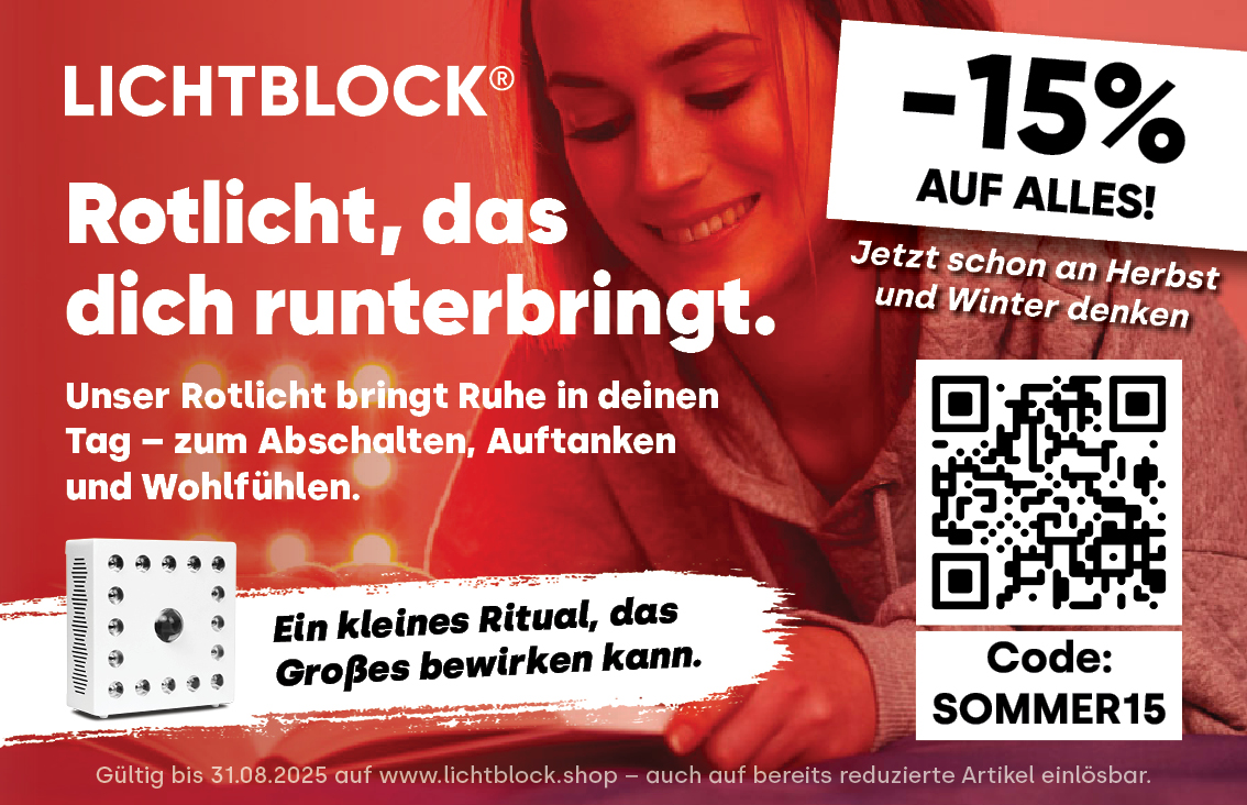 -15% AUF ALLES! Rotlicht, das dich runterbringt. Lichtblock GmbH Startdatum 07.07.2025 Ablaufdatum 31.08.2025 Jetzt schon an Herbst und Winter denken.Unser Rotlicht bringt Ruhe in deinen Tag - zum Abschalten, Auftanken und Wohlfühlen.Ein kleines Ritual, das Großes bewirken kann. Code SOMMER15 Couponcode kopieren Coupon einlösen Coupon drucken!