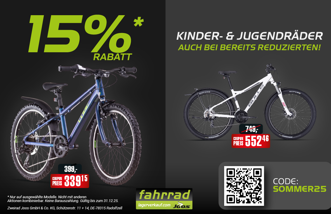 15% RABATT! KINDER- & JUGENDRÄDER, AUCH BEI BEREITS REDUZIERTEN! Zweirad Joos GmbH & Co. KG Startdatum 07.07.2025 Ablaufdatum 31.12.2025 Fahrrad, Kinderfahrrad, Bike Code SOMMER25 Couponcode kopieren Coupon einlösen Coupon drucken! Endet in