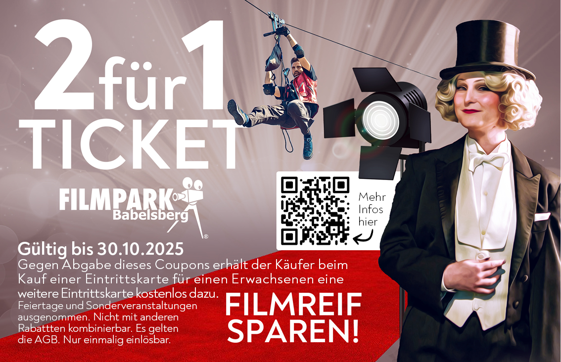 2 für 1. TICKET bei FILMPARK Babelsberg. Jetzt FILMREIF SPAREN! Filmpark Babelsberg GmbH Startdatum 07.07.2025 Ablaufdatum 30.10.2025 Kein Code notwendig Zum Angebot Coupon drucken! Endet in