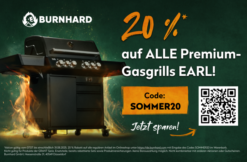20% auf ALLE Premium-Gasgrills EARL! Jetzt sparen bei BURNHARD Burnhard GmbH Startdatum 07.07.2025 Ablaufdatum 31.08.2025 Geil grillen mit BURNHARD *grill&feuer Code SOMMER20 Couponcode kopieren Coupon einlösen Coupon drucken!