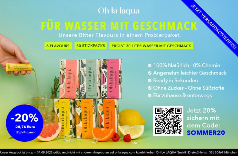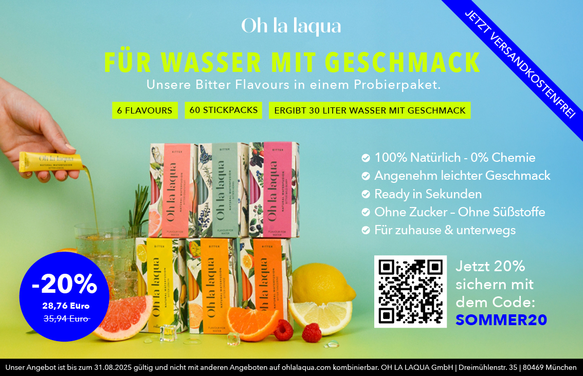 20 % Rabatt auf alle Flavour Sets – Sommer genießen mit natürlichem Geschmack für dein Wasser! OH LA LAQUA GmbH Startdatum 07.07.2025 Ablaufdatum 31.08.2025 Code SOMMER20 Couponcode kopieren Coupon einlösen Coupon drucken! Preis ohne Coupon 35.94€ Preis mit Coupon 28.76€ Ersparnis 7.18€