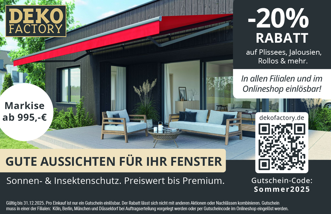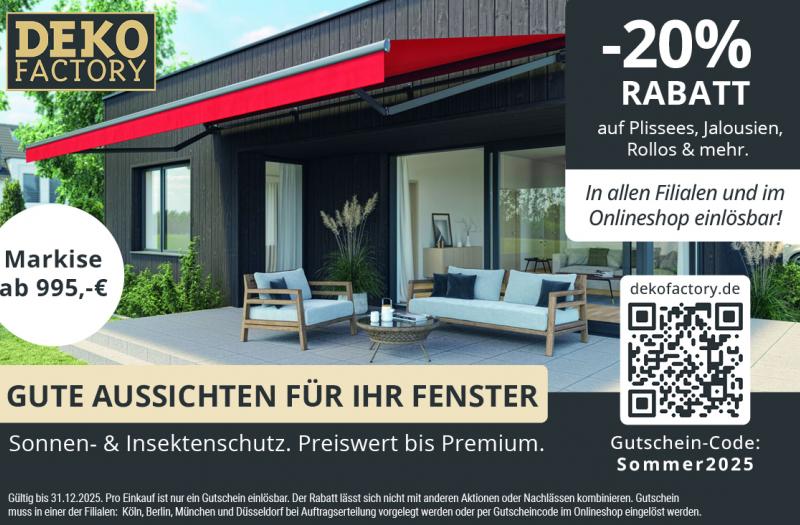 20% RABATT auf Markisen (ab 995€) bei DEKO FACTORY! DEKOFACTORY Startdatum 05.08.2025 Ablaufdatum 31.12.2025 GUTE AUSSICHTEN FÜR IHR FENSTERSichtschutz, Sonnenschutz & Insektenschutz. Preiswert bis Premium. 20% RABATT auf Plissees, Jalousien, Markisen, Rollos & mehr bei DEKO FACTORY *home&living Code Sommer2025 Couponcode kopieren Coupon einlösen Coupon drucken! Endet in