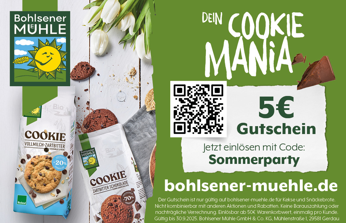 Entdecke Bio-Kekse und Snäckebrote von der Bohlsener Mühle und spare mit dem Gutscheincode „Sommerparty“ bis zu 20% auf Kekse & Snacks. Gebacken mit besten Getreide, Vollkornanteil und richtig lecker.