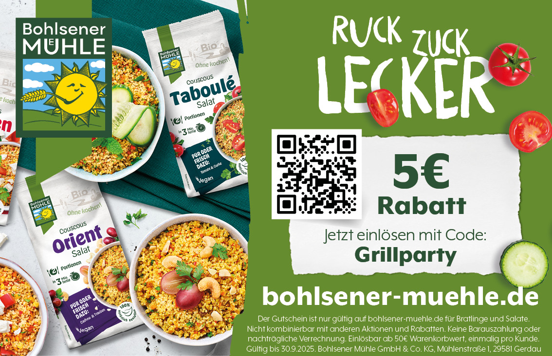 Entdecke schnelle Bio- Couscous Salate und Bio-Bratlinge von der Bohlsener Mühle und spare mit dem Gutscheincode „Grillparty“ 5 Euro + Versandkosten bei bei Couscous-Salaten (fertig in 5 Minuten) und Bratlingen mit pflanzlichem Protein, ohne Schnick-Schnack.