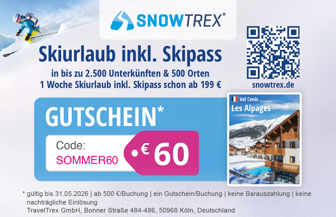 Ob Hotel, Appartement oder Chalet – bei SnowTrex findest Du Deinen Traum-Skiurlaub in Österreich, Italien, Frankreich, Deutschland oder der Schweiz – und das bereits ab 199 € für 7 Nächte Reise – inklusive Skipass! Jetzt 60 €* sparen!