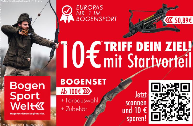 Bereit fürs Abenteuer? Hol dir dein Starter-Set mit 10€ Rabatt! BogenSportWelt Startdatum 07.07.2025 Ablaufdatum 31.12.2025 Code Sommer25 Couponcode kopieren Coupon einlösen Coupon drucken! Endet in