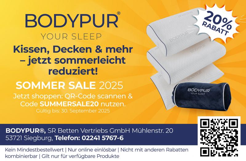 ERHALTE 20 % RABATT BEI BODYPUR - YOUR SLEEP Kissen, Decken & mehr - jetzt sommerleicht reduziert! BODYPUR Startdatum 07.07.2025 Ablaufdatum 30.09.2025 *home&living Code SUMMERSALE20 Couponcode kopieren Coupon einlösen Coupon drucken!