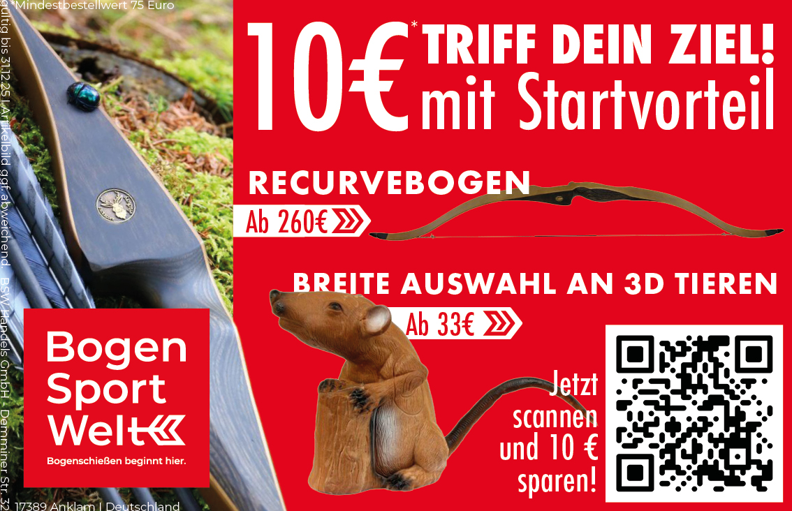 Erwecke den Wald oder deinen Garten zum Leben – mit Recurvebögen & 3D-Zielen BogenSportWelt Startdatum 07.07.2025 Ablaufdatum 31.12.2025 Code Sommer25 Couponcode kopieren Coupon einlösen Coupon drucken! Endet in