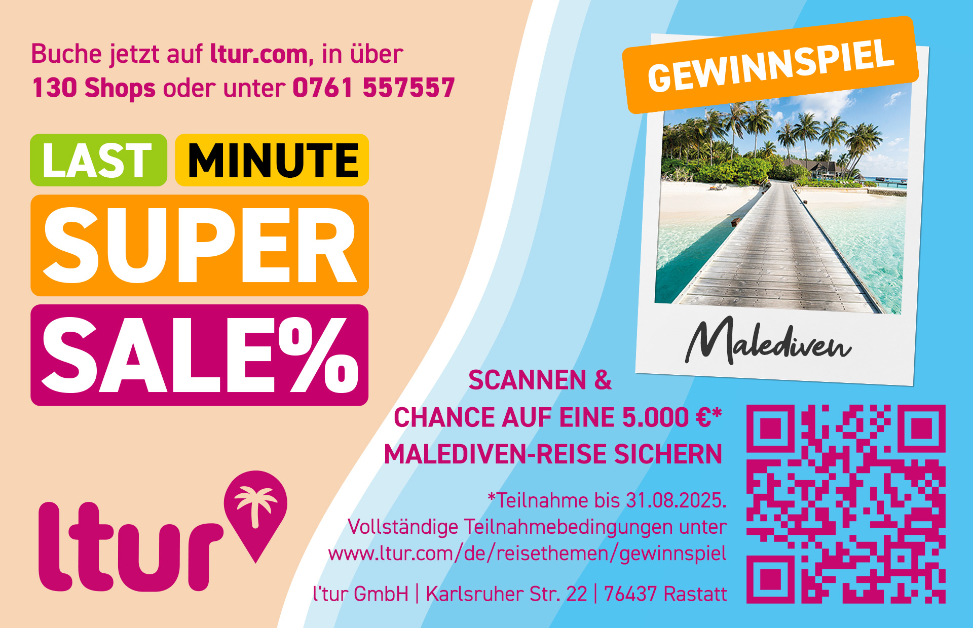 Sichere dir jetzt bis zu 50 % Rabatt auf deinen Last Minute Sommerurlaub auf www.ltur.com, im ltur Reise-Shop in deiner Nähe oder telefonisch unter 0761 / 557 557 (Festnetz).