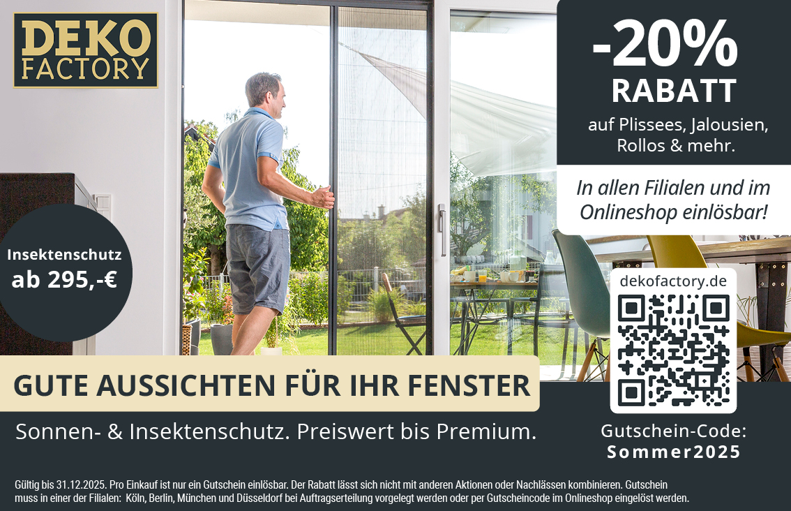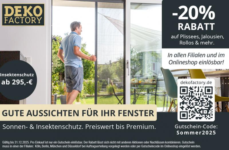 Insektenschutz ab 295€ mit 20% Gutschein DEKOFACTORY Startdatum 05.08.2025 Ablaufdatum 31.12.2025 GUTE AUSSICHTEN FÜR IHR FENSTERSichtschutz, Sonnenschutz & Insektenschutz. Preiswert bis Premium. 20% RABATT auf Plissees, Jalousien, Markisen, Rollos, Fliegengitter & mehr bei DEKO FACTORY Code Sommer2025 Couponcode kopieren Coupon einlösen Coupon drucken! Endet in