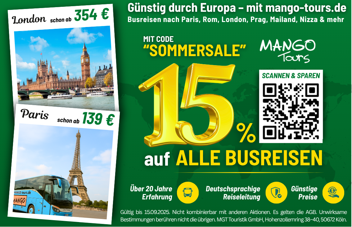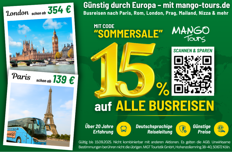 Günstig durch Europa - mit mango-tours.de Busreisen nach Paris, Rom, London, Prag, Mailand, Nizza & mehr.