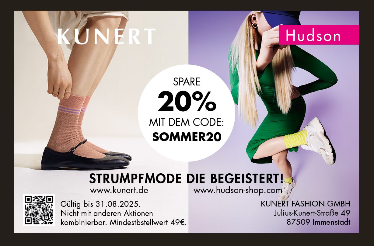 JETZT -20% AUF UNSERE SOMMER-KOLLEKTION! Hudson STRUMPFMODE DIE BEGEISTERT! KUNERT FASHION GMBH Startdatum 01.08.2025 Ablaufdatum 31.08.2025 Code SOMMER20 Couponcode kopieren Coupon einlösen Coupon drucken!