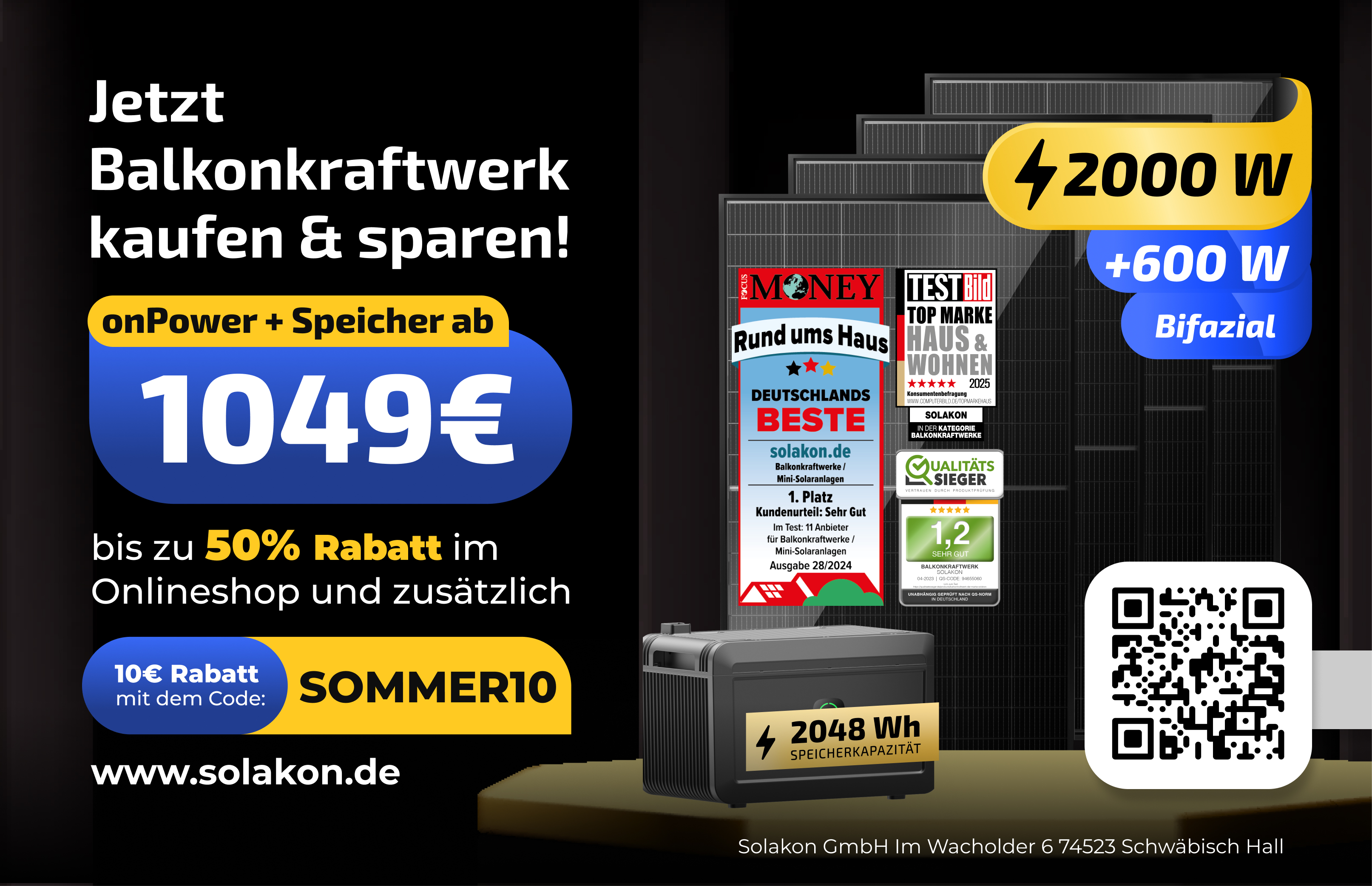 Jetzt Balkonkraftwerk kaufen & sparen! bis zu 50% Rabatt im Onlineshop und zusätzlich 10€ Rabatt mit dem Code: SOMMER1O Solakon GmbH Startdatum 07.07.2025 Ablaufdatum 31.12.2025 *haus&garten Code SOMMER1O Couponcode kopieren Coupon einlösen Coupon drucken! Endet in