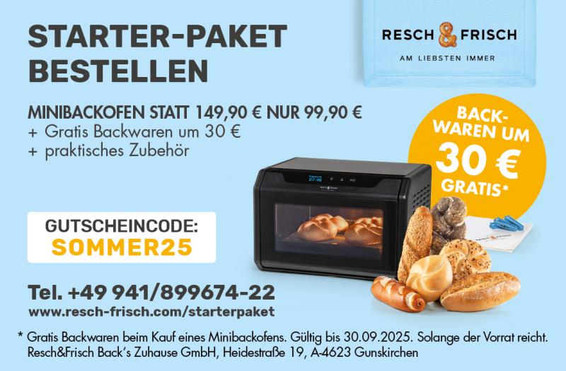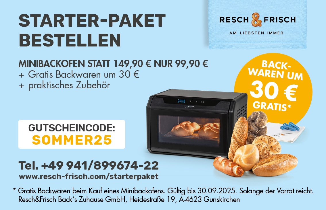Ofenfrische Backwaren – wann immer du willst Resch & Frisch Holding GmbH Startdatum 07.07.2025 Ablaufdatum 30.09.2025 Gebäck bestellen, liefern lassen und in wenigen Minuten im Resch & Frisch Backofen backen & genießen. Code SOMMER25 Couponcode kopieren Coupon einlösen Coupon drucken! Preis ohne Coupon 149.90€ Preis mit Coupon 99.90€ Ersparnis 50.00€