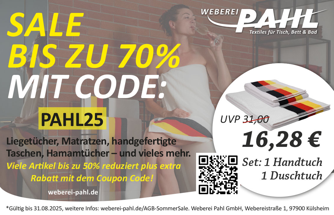SALE BIS ZU 70%! Liegetücher, Matratzen, handgefertigte Taschen, Hamamtücher - und vieles mehr. Weberei Pahl GmbH Startdatum 07.07.2025 Ablaufdatum 31.08.2025 Set: 1 Handtuch& 1 DuschtuchViele weitere Artikel bis zu 50% reduziert plus extra Rabatt mit dem Coupon Code! *home&living Code PAHL25 Couponcode kopieren Coupon einlösen Coupon drucken! Preis ohne Coupon 31.00€ Preis mit Coupon 16.28€ Ersparnis 14.72€