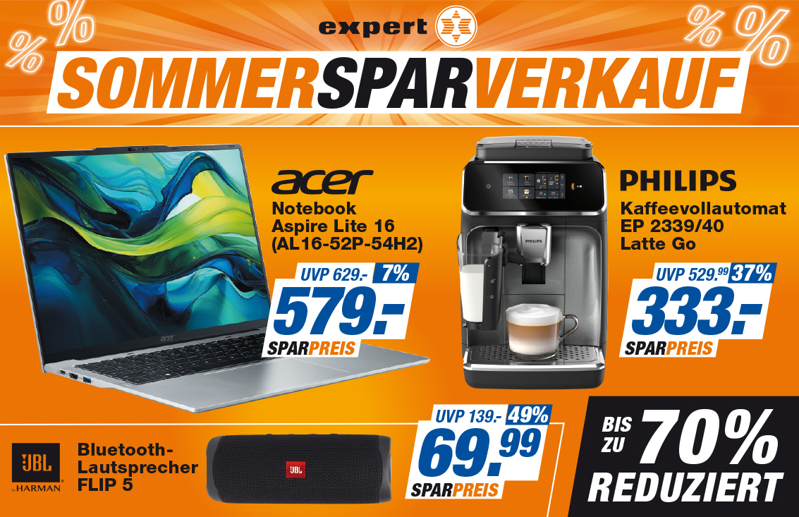 SOMMERSPARVERKAUF | BIS ZU 70% REDUZIERT bei expert expert Startdatum 13.08.2025 Ablaufdatum 31.08.2025 electronics bei expert BIS ZU 70% REDUZIERT! Notebook, Kaffeevollautomat, JBL Bluetooth Lautsprecher Kein Code notwendig Zum Angebot Coupon drucken!
