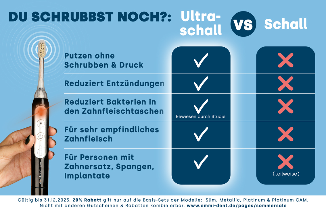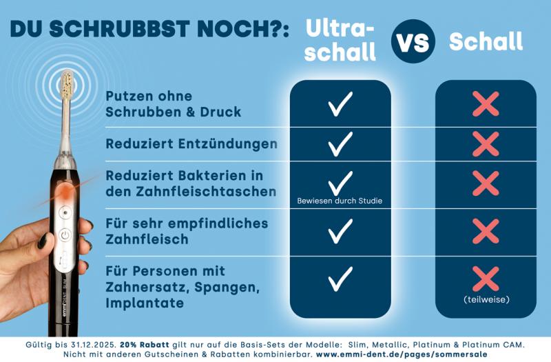 Der Ultraschall gelangt tief in Zahnzwischenräume und Zahnfleischtaschen, wo klassische Zahnbürsten nicht hinkommen. Dort reduziert er Bakterien und sorgt für gesunde Zähne, frischen Atem und spürbar glattere Zahnoberflächen – für eine Zahnpflege auf höchstem Niveau.