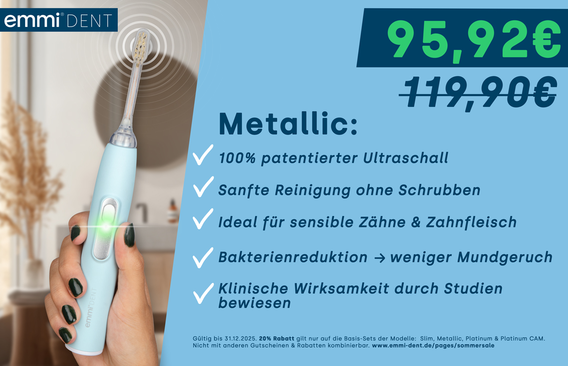 Der Ultraschall gelangt tief in Zahnzwischenräume und Zahnfleischtaschen, wo klassische Zahnbürsten nicht hinkommen. Dort reduziert er Bakterien und sorgt für gesunde Zähne, frischen Atem und spürbar glattere Zahnoberflächen – für eine Zahnpflege auf höchstem Niveau.
