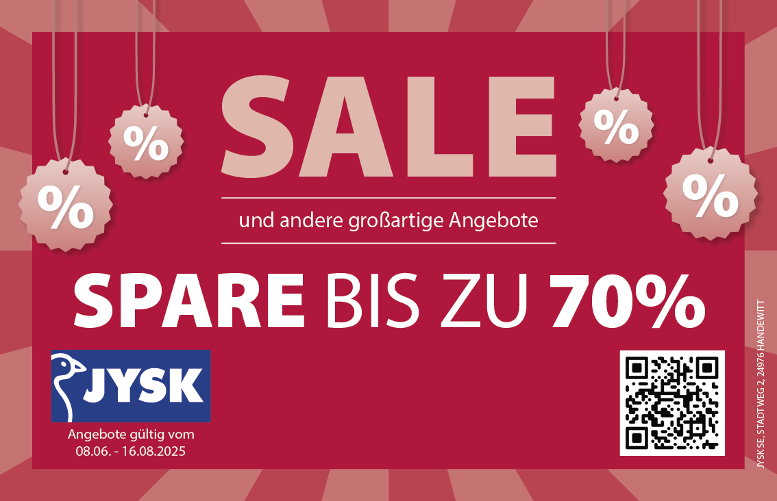 SPARE BIS ZU 70% und andere großartige Angebote bei JYSK. Jysk SE Startdatum 07.07.2025 Ablaufdatum 16.08.2025 *haus&garten Kein Code notwendig Zum Angebot Coupon drucken!