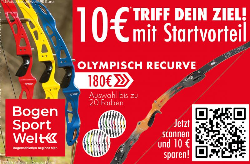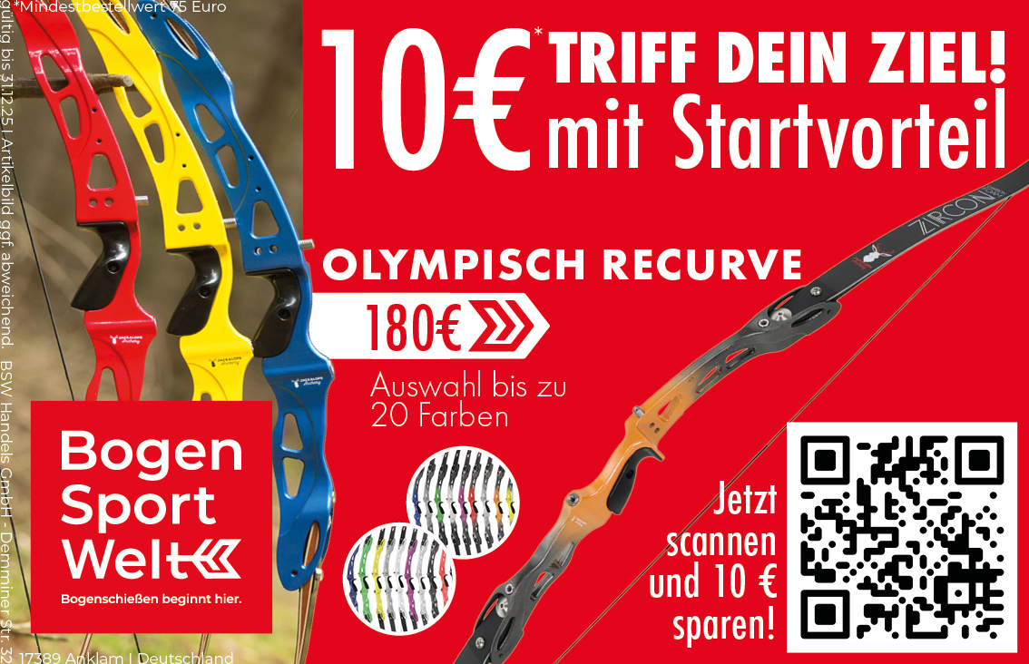 Technik. Präzision. Rabatt – dein Weg zum Olympisch-Recurve. BogenSportWelt Startdatum 07.07.2025 Ablaufdatum 31.12.2025 Code Sommer25 Couponcode kopieren Coupon einlösen Coupon drucken! Endet in