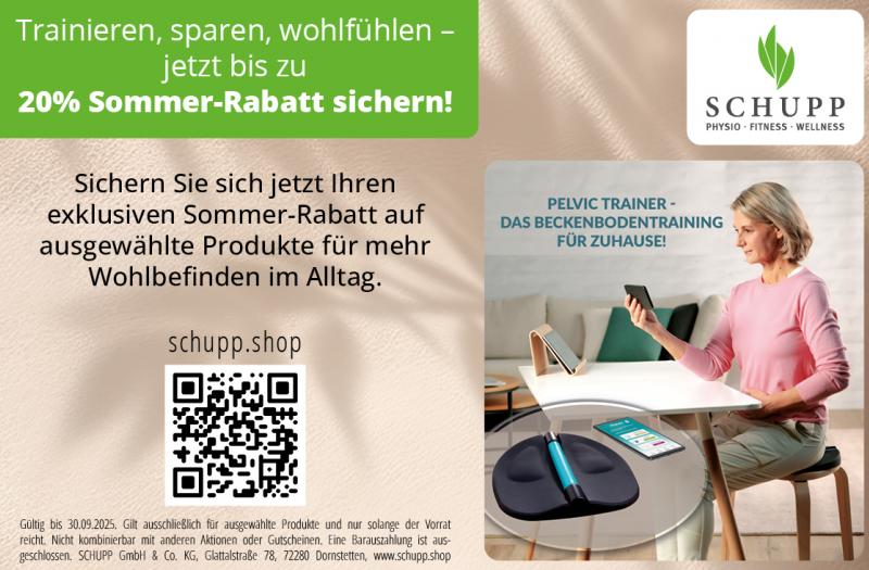Trainieren, sparen, wohlfühlen – jetzt bis zu 20% Sommer-Rabatt sichern! Schupp GmbH & Co. KG Startdatum 07.07.2025 Ablaufdatum 30.09.2025 Sichern Sie sich jetzt Ihren exklusiven Sommer-Rabatt auf ausgewählte Produkte für mehr Wohlbefinden im Alltag. Kein Code notwendig Zum Angebot Coupon drucken!
