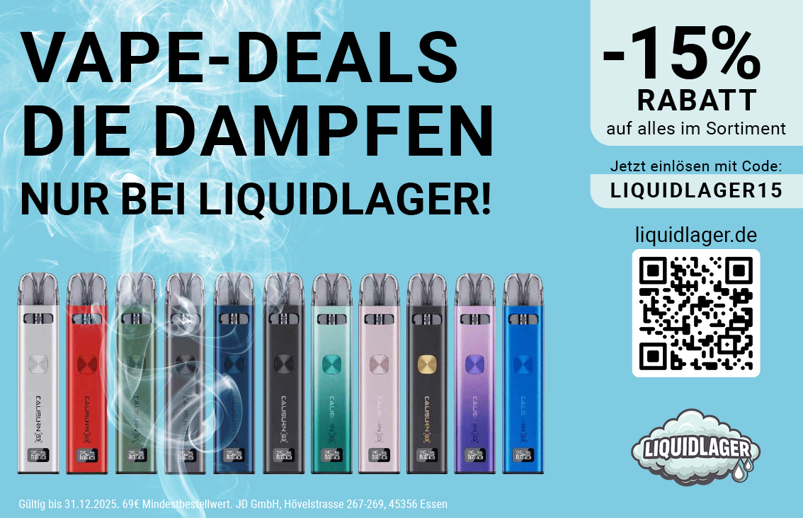 VAPE DEALS DIE DAMPFEN! -15% Rabatt auf alles im Sortiment- Nur bei LIQUIDLAGER JD GmbH Startdatum 07.07.2025 Ablaufdatum 31.12.2025 Code LIQUIDLAGER15 Couponcode kopieren Coupon einlösen Coupon drucken! Endet in