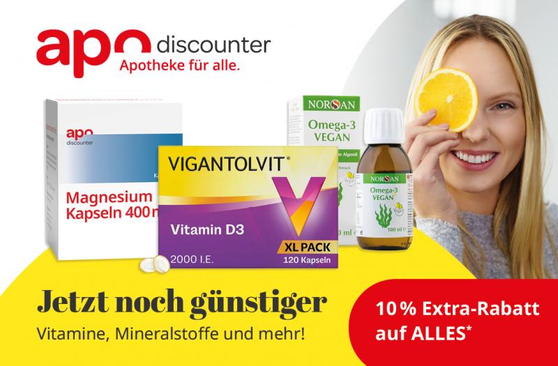 Jetzt noch günstiger Vitamine, Mineralstoffe und mehr! 10% Extra-Rabatt auf ALLES* bei apo discounter Mehr Details