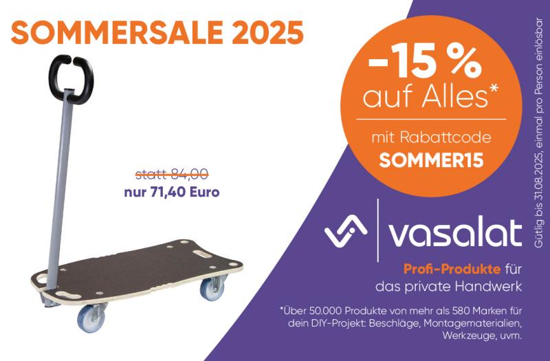 -15 % auf Alles bei vasalat.com | Über 50.000 Produkte von mehr als 580 Marken für dein DIY-Projekt: Beschläge, Montagematerialien, Werkzeuge, uvm. Mehr Details