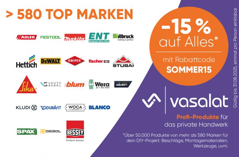 -15 % auf Alles bei vasalat.com | Über 50.000 Produkte von mehr als 580 Marken für dein DIY-Projekt: Beschläge, Montagematerialien, Werkzeuge, uvm. Mehr Details