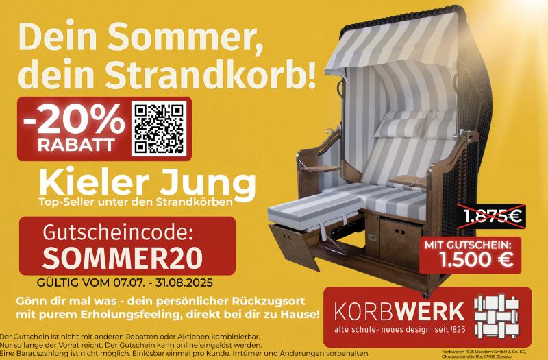Dein Sommer, dein Strandkorb! Erhalte 20 % Rabatt auf den Topseller der Strandkörbe " Kieler Jung" Mehr Details