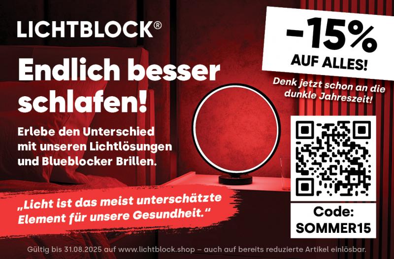-15% AUF ALLES! Endlich besser schlafen! LICHTBLOCK! Lichtblock GmbH Startdatum 07.07.2025 Ablaufdatum 31.08.2025 Erlebe den Unterschied mit unseren Lichtlösungen und Blueblocker Brillen.Denk jetzt schon an die dunkle Jahreszeit!„Licht ist das meist unterschätzte Element für unsere Gesundheit." Code SOMMER15 Couponcode kopieren Coupon einlösen Coupon drucken!