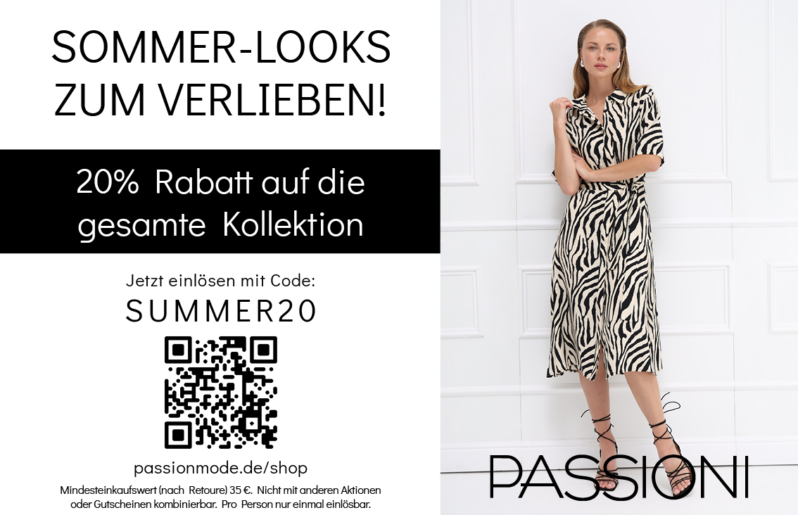 20% Rabatt auf die gesamte Kollektion | Sommer-Looks zum Verlieben! PASSIONI Passion Mode GmbH Startdatum 07.07.2025 Ablaufdatum 31.12.2025 Fashion, Mode & Sommer-Looks zum Verlieben! *fashion Code SUMMER20 Couponcode kopieren Coupon einlösen Coupon drucken! Endet in