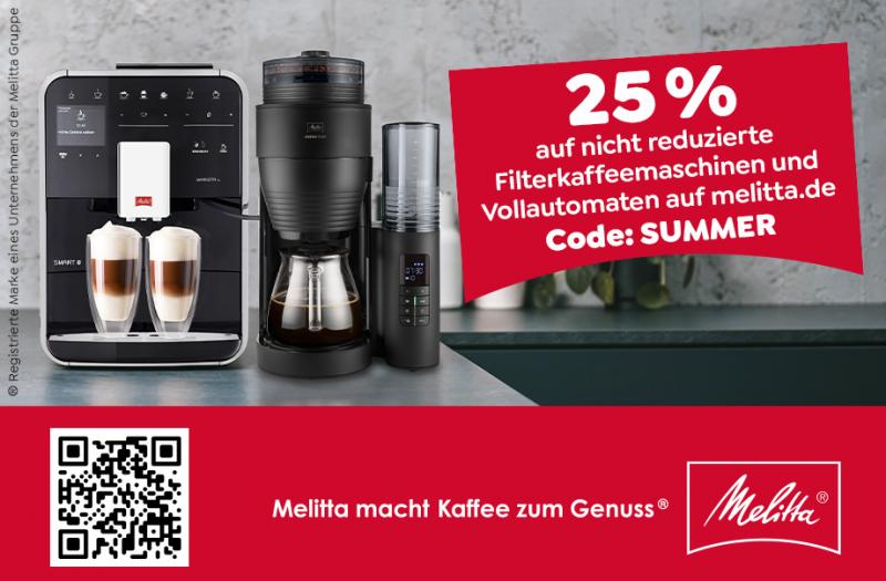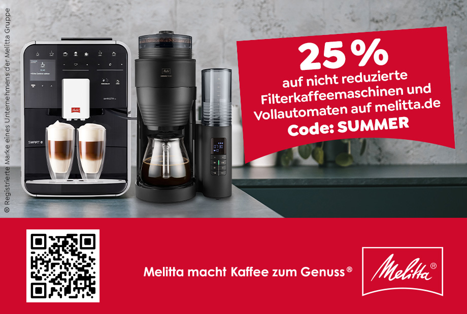 25% auf nicht reduzierte Filterkaffeemaschinen und Vollautomaten | Melitta macht Kaffee zum Genuss Melitta Europa GmbH & CO.KG Startdatum 07.07.2025 Ablaufdatum 31.08.2025 *home&living Code SUMMER Couponcode kopieren Coupon einlösen Coupon drucken!