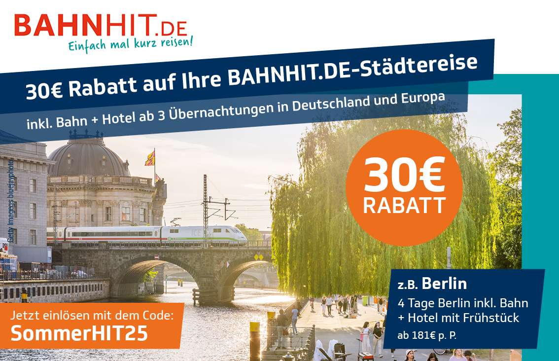 Entdecken Sie mit BAHNHIT.DE über 80 Städte in Deutschland und Europa inkl. An- und Abreise mit der Bahn und Sitzplatzreservierung sowie Übernachtungen mit Frühstück in ausgewählten Hotels. Jetzt buchen und bis zum 14.09.2025 mit dem Code „SommerHIT25“ 30€ Rabatt auf Ihre 4 Tage Städtereise sichern!