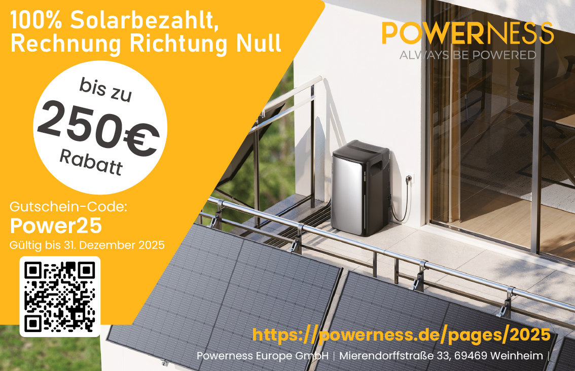 bis zu 250€ Rabatt! 100% Solarbezahlt, Rechnung Richtung Null Powerness Europe GmbH Startdatum 07.07.2025 Ablaufdatum 31.12.2025 *haus&garten Code Power25 Couponcode kopieren Coupon einlösen Coupon drucken! Endet in