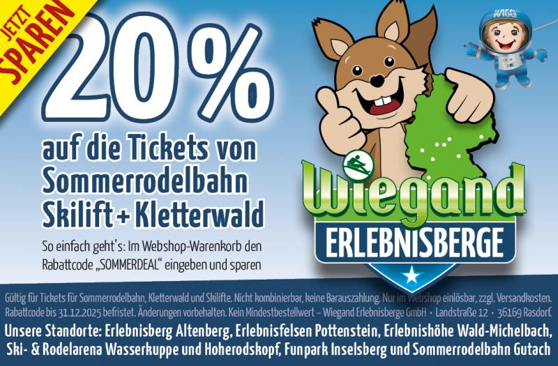 20% Wiegand ERLEBNISBERGE auf die Tickets von Sommerrodelbahn Skilift+ Kletterwald Mehr Details Endet in